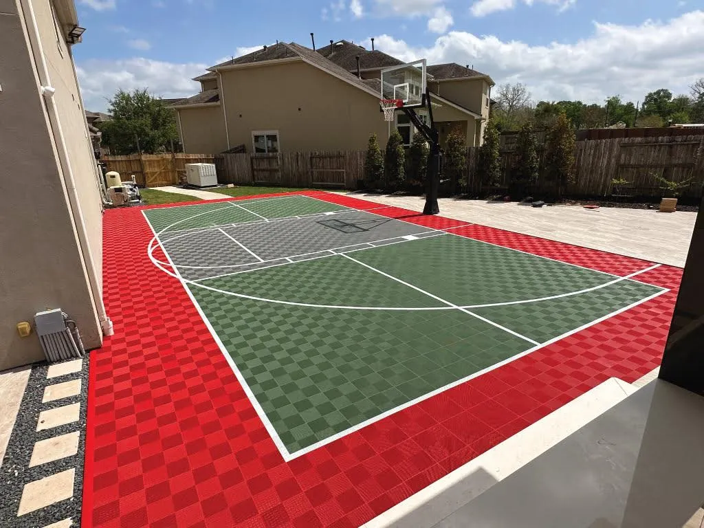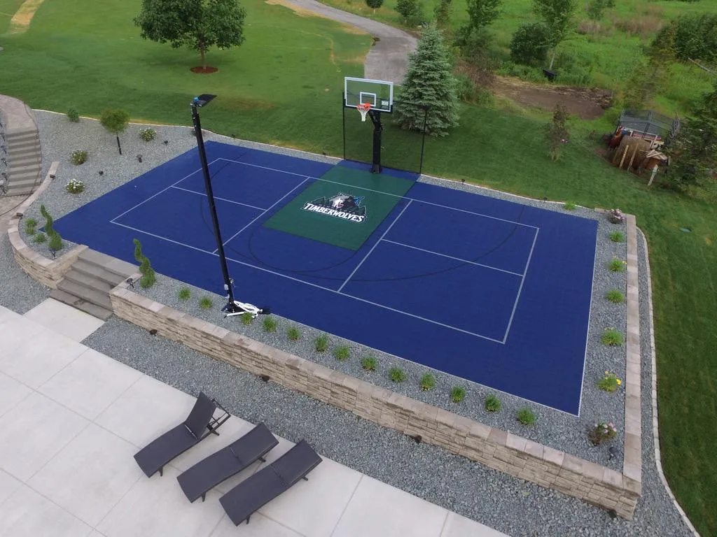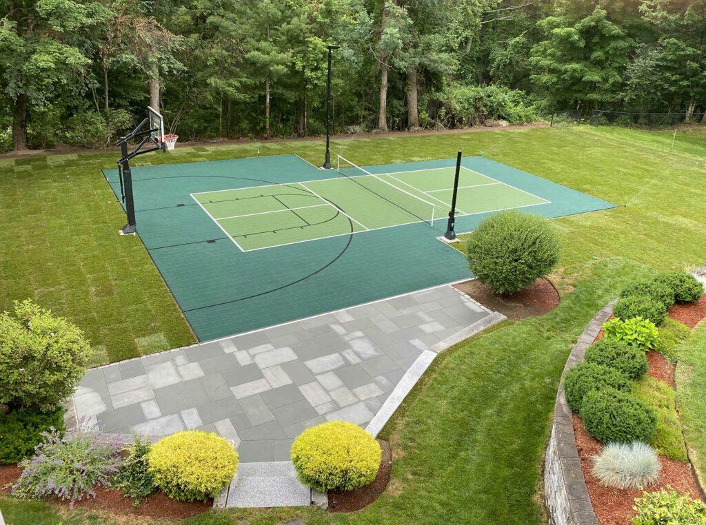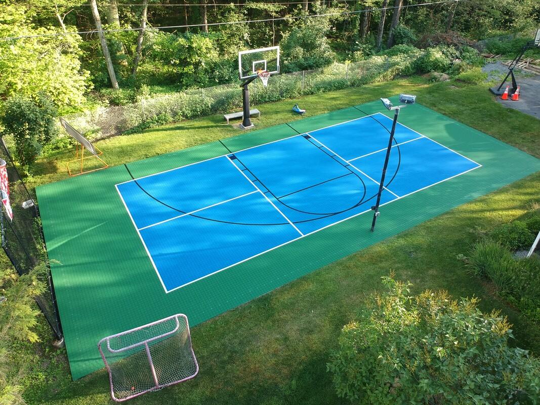 - A 30’x60’ Sports Court that includes Concrete, Court Tiles, Basketball Hoop, High and Low net system for badminton and pickleball, and 4 solar lights, starts at $40,000 plus site work.